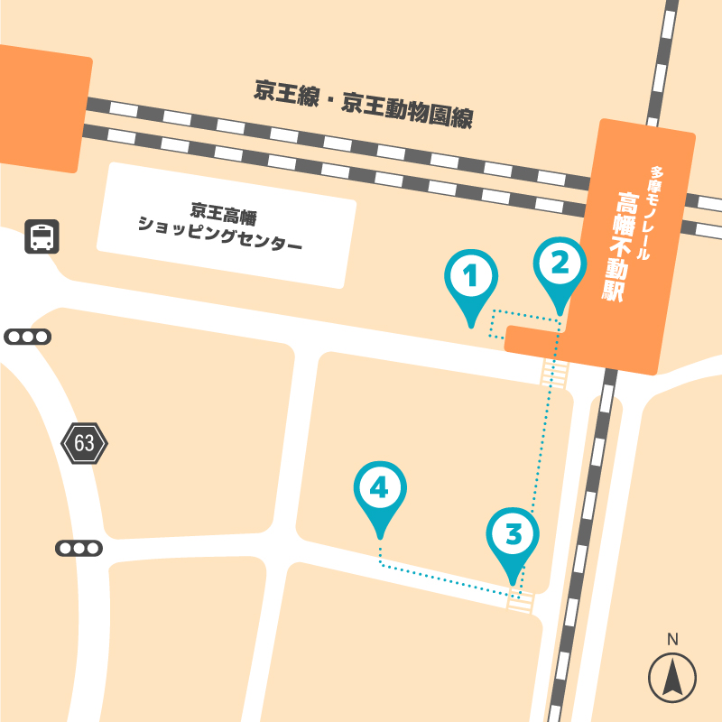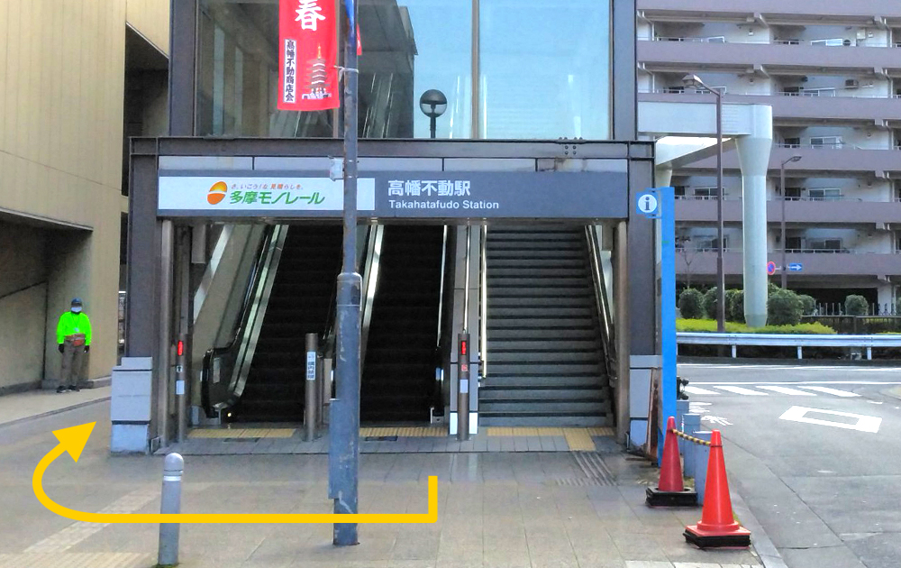 多摩モノレール高幡不動駅南口のエスカレーターを下り、左側(エスカレーター裏側の方)へすすむ。