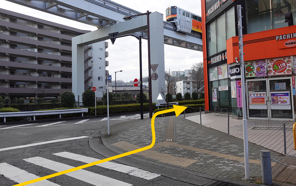 右手の横断歩道を渡りパチンコ屋さんとモノレール線路の間の道をすすむ。